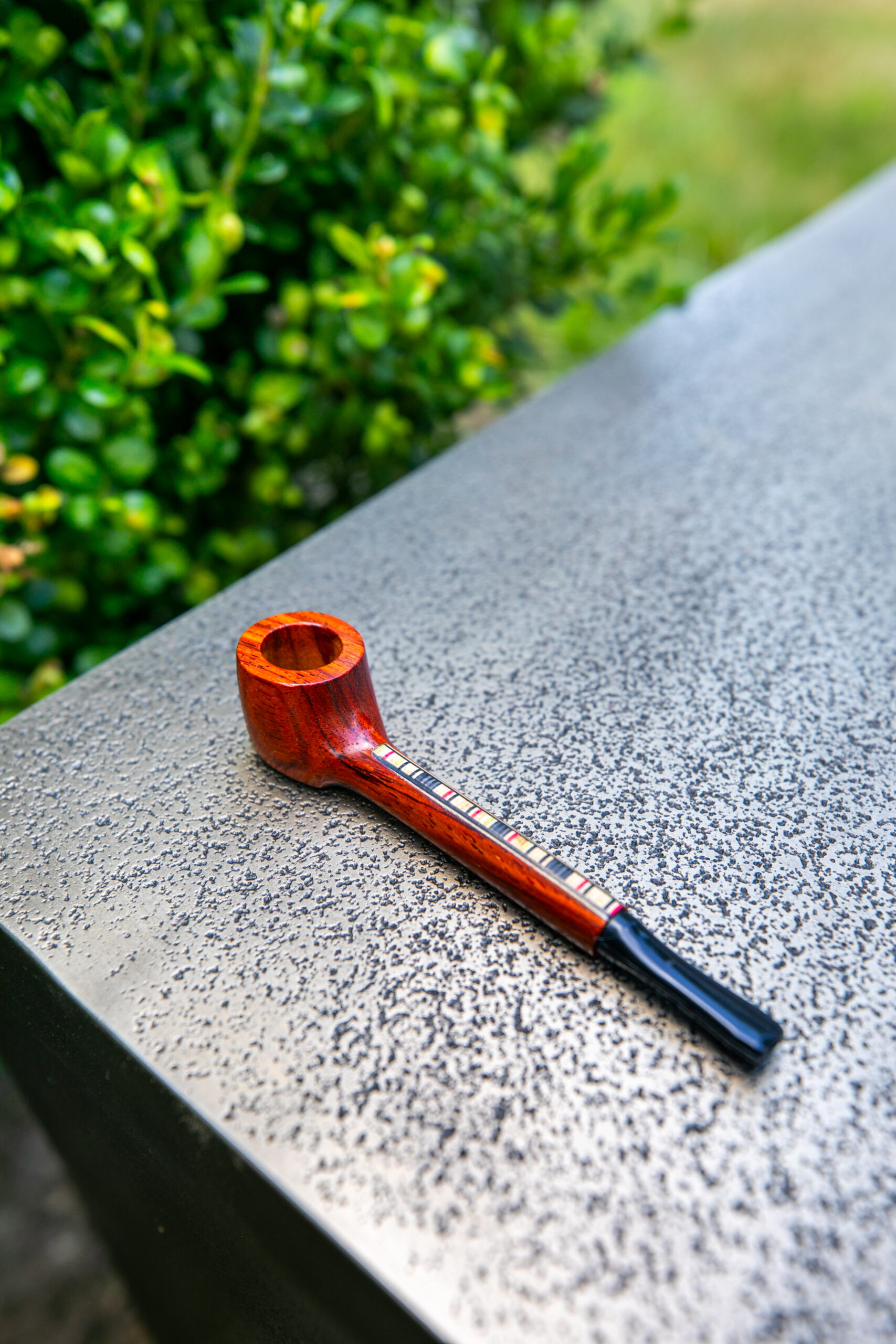 Brazilian Kingwood with Native American inlay distinguishes this 4 1/2″ beautiful wood pipe.