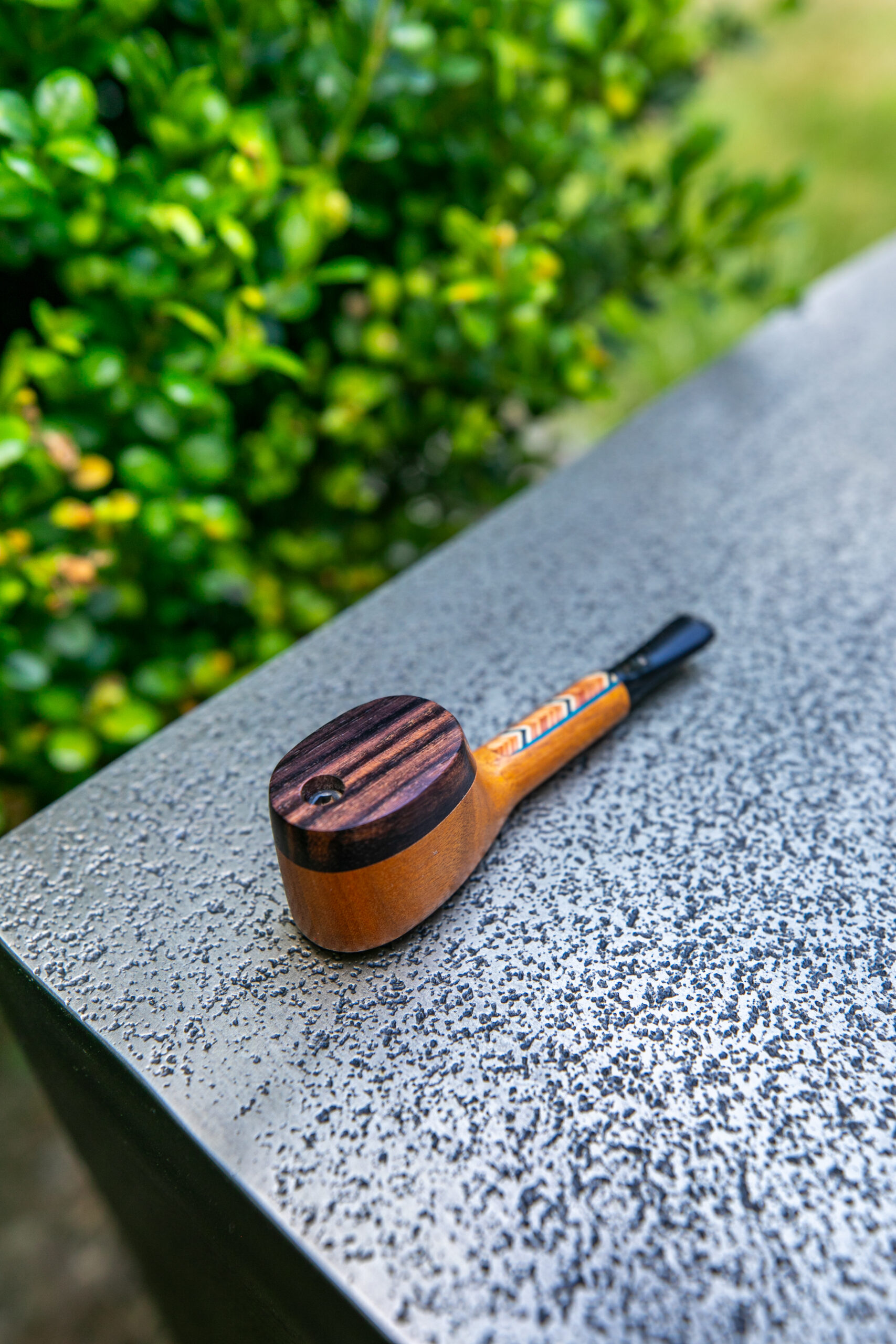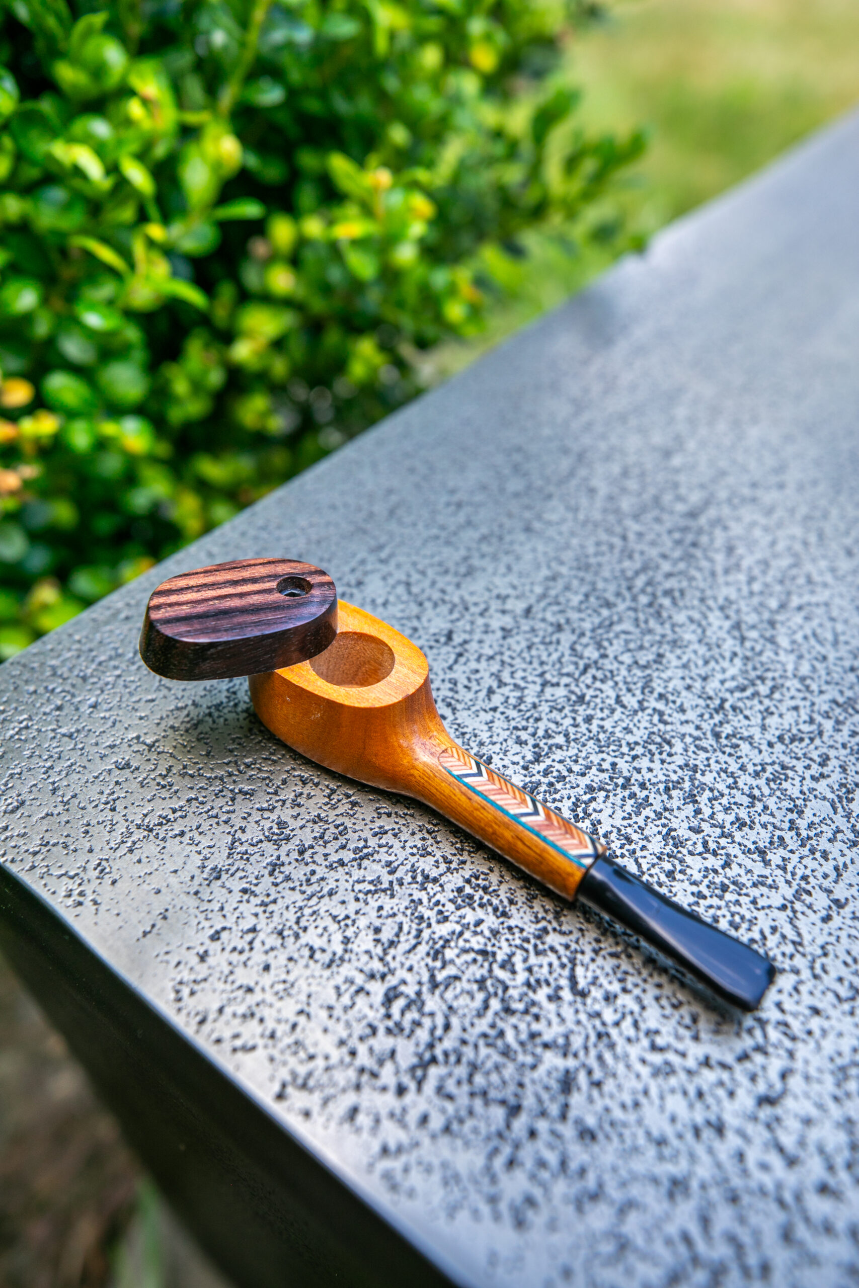 L-56 The only capper with native inspired inlay offers the possibility of extended pleasure maintenance. After each hit close the cap and refer to it every ½ hour or so. 8/16” bowl, 2 7/8” wood stem + 1 1/8” mouthpiece = 4” length.