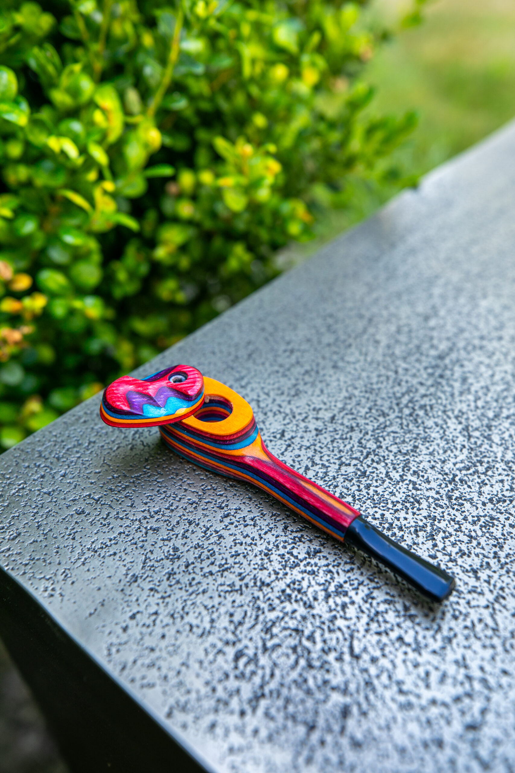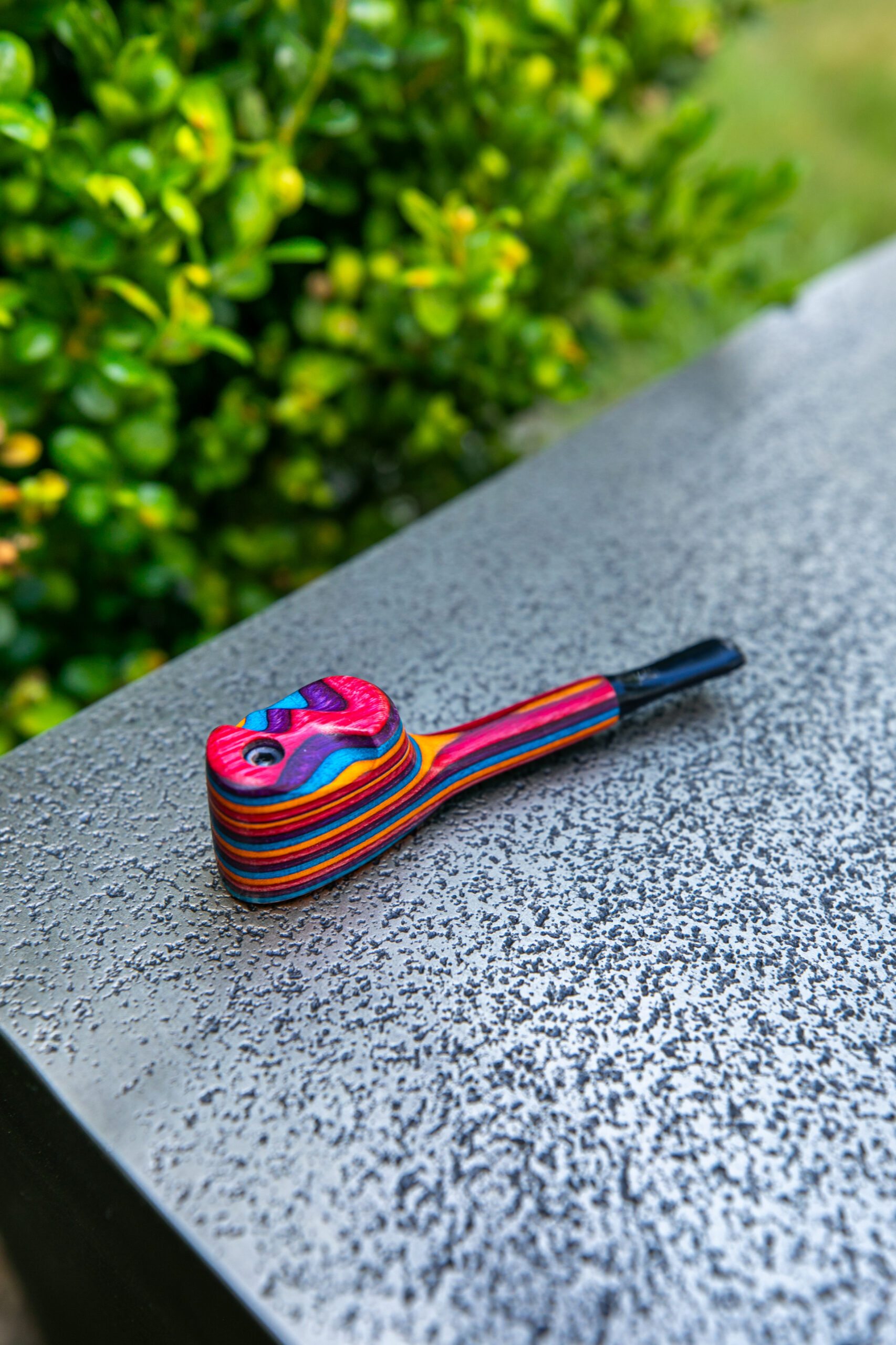 This is a Rainbow Wood pipe. Laminated Rainbow Wood is very showy when cut through different layers.