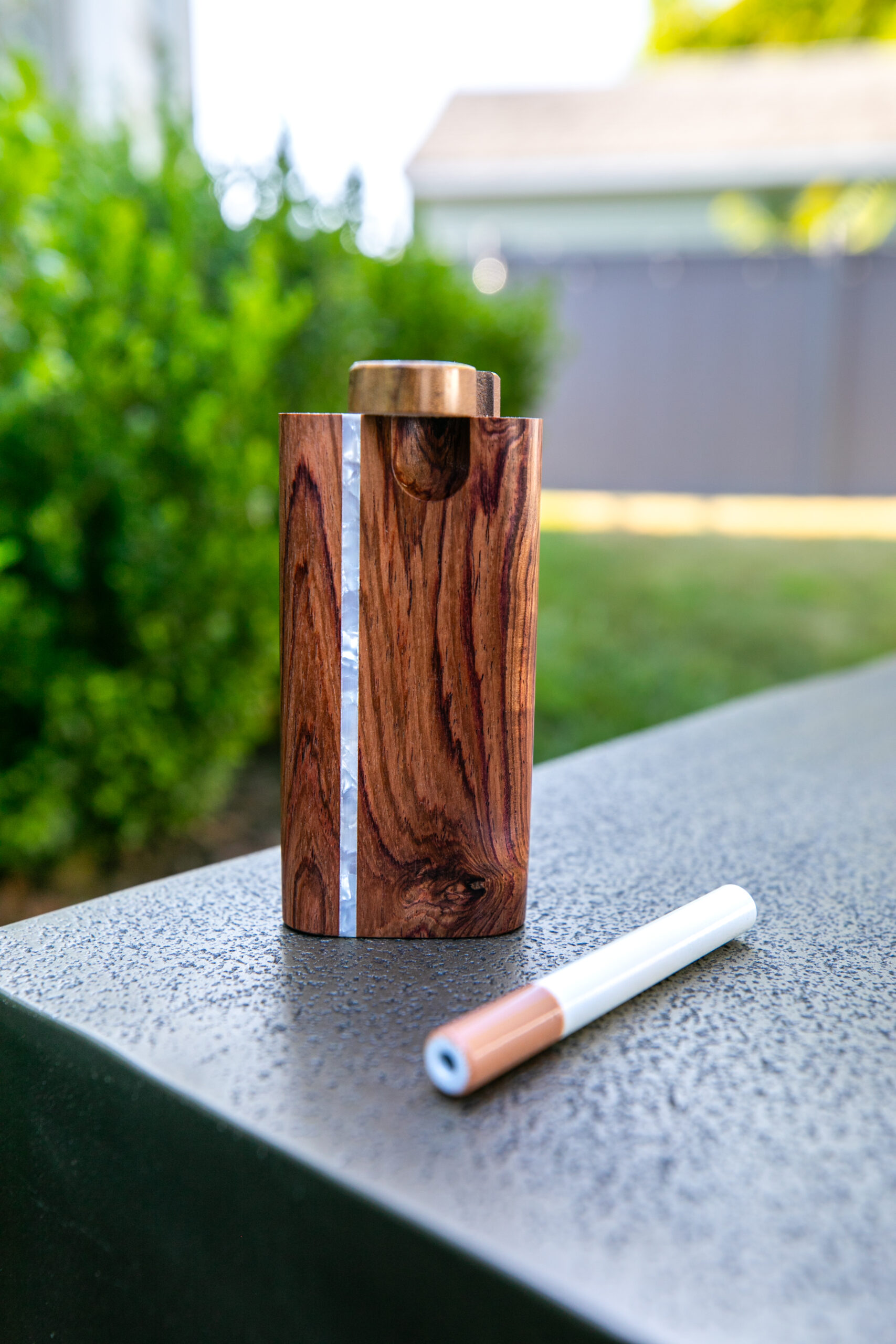 Large honduras wood dugout with pearl inlay and swivel top. Large anodized cigarette smoker included.